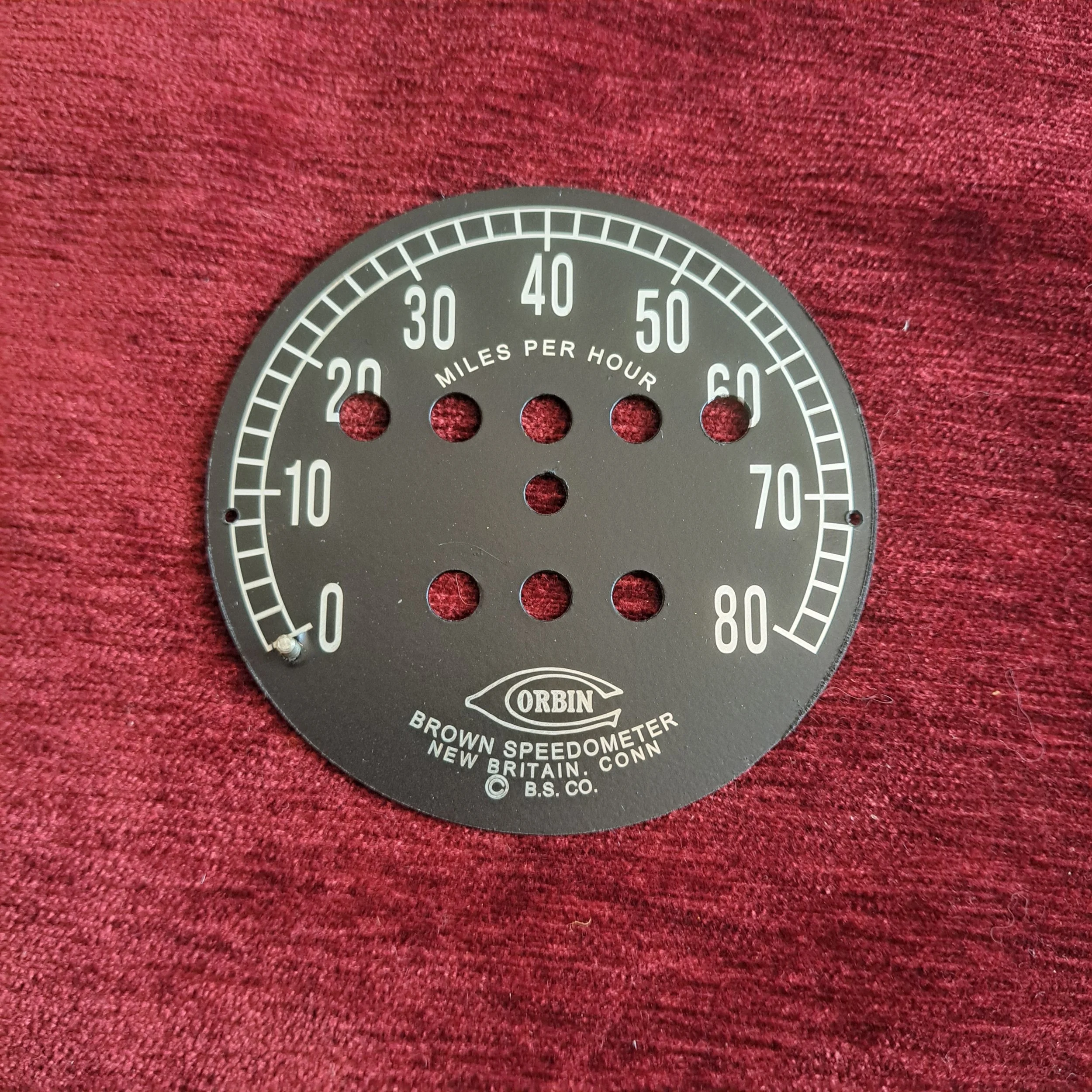 New reproduction face, made in house. 80 MPH “railroad track face” and early Corbin-Brown logo. Also available with the later oval Corbin logo.